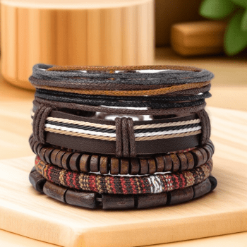 Unisex Leather & Bead Braided Bracelet Set – 5-Piece Adjustable Boho Wristband